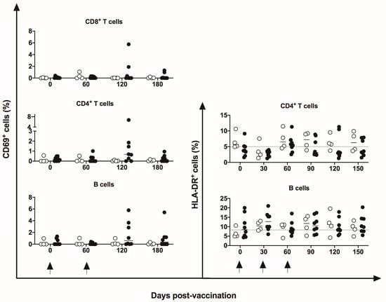 Frequency of activation marker CD69+ in peripheral blood. Frequency of CD4+/CD69+, CD8+/CD69+, and CD19+/CD69+ cells in unvaccinated (open circles) and electroporated DNA-hsp65 vaccinated (black circles) cynomolgus macaques. Arrows represent the three doses of vaccine.
