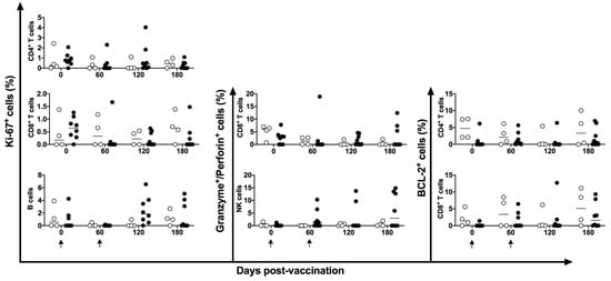 Frequency of proliferation, lytic and apoptotic markers in peripheral blood. Frequency of CD4+, CD8+, and CD19+ cells expressing Ki67+, BCL2+, and granzyme/perforin markers in unvaccinated (open circles) and electroporated DNA-hsp65 vaccinated (black circles) cynomolgus macaques. Arrows represent the three doses of vaccine.