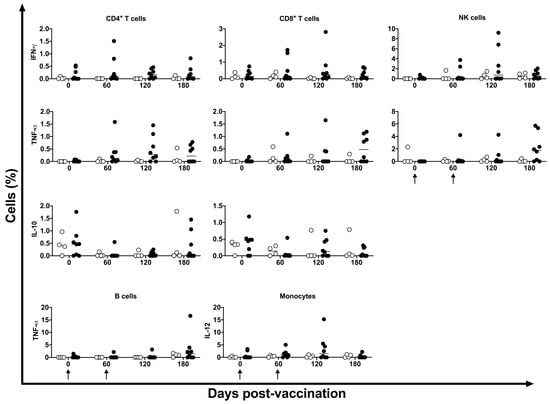 De novo cytokine expression in immune cells. Expression of IFN-γ, TNF-α, IL10, and IL-12 in CD4+ and CD8+ T cells, NK cells, and CD19+ and CD14+ cells was identified after stimulus of the cells with HSP65 peptide pool in unvaccinated (open circles) and electroporated DNA-hsp65 vaccinated (black circles) cynomolgus macaques. Arrows represent the three doses of vaccine.
