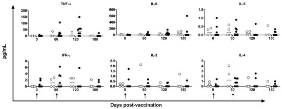 De novo cytokines quantification in supernatant. TNF-α, IL-6, IL-5, IFN-γ, IL-2, and IL-4 were measured in the supernatant of stimulated cell culture with HSP65 peptides pool by CBA in unvaccinated (open circles) and electroporated DNA-hsp65 vaccinated (black circles) cynomolgus macaques. Arrows represent the three doses of vaccine.