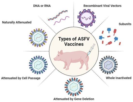 Trends in advances in vaccines against ASFV. Recombinant viral vector vaccines, subunit vaccines, whole inactivated ASF virus vaccines, gene-deleted attenuated vaccines, vaccines attenuated by cell passage, naturally attenuated vaccines and DNA or RNA vaccines. Created with BioRender.com (accessed on 25 December 2022).