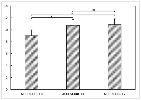 We also evaluated disease activity at different times through the AECT questionnaire. AECT was available for 23 out of 31 patients. The mean AECT score was 9 ± 3.5 points at T0, 10.7 ± 3.3 at T1, and 10.8 ± 3.2 at T2. ANOVA performed on AECT showed a significant difference among the three visits [F(2,44) = 6.541; p < 0.05]. Post hoc comparisons revealed a higher AECT score at T1 (post hoc p < 0.05) and T2 (post hoc p < 0.05) compared to T0, suggesting that the disease was rather more controlled after vaccinations than in the previous period. No significant difference was observable between T1 and T2 (post hoc p = 0.994) (Figure 1).