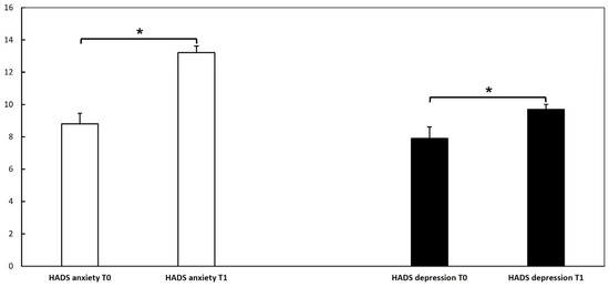 Hospital anxiety and depression scale (HADS) questionnaire at T0, T1, and T2 in our hereditary angioedema cohort. The analysis of dependent variable HADS for depression was performed with the Wilcoxon test, and for anxiety with a paired t-test; it revealed a significant difference (*) between T0 and T1 (p < 0.05), showing a higher score at T1 (at the second dose) compared to T0 (at the first dose). These results could suggest that vaccination may have affected patients’ anxiety status.