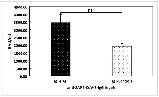 Comparison between hereditary angioedema (HAE) patients’ and healthy controls’ anti-trimeric spike protein-specific IgG antibodies to SARS-CoV−2 (IgT) levels at T2. No significant difference (ns) was found between the two groups of patients (U = 162; p = 0.062).