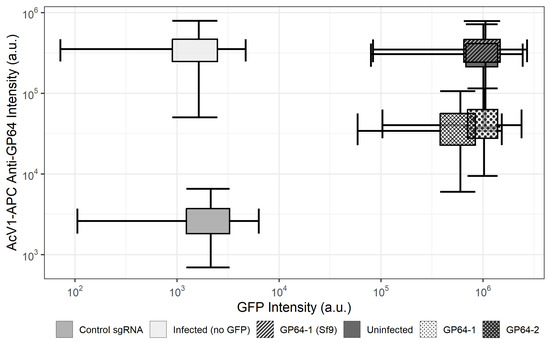 CRISPR-mediated disruption of gp64 reduces GP64 abundance in the membrane of Sf9-Cas9 cells compared to parental Sf9 cells. Fluorescence intensity for control and gp64-targeted rBEVs expressing the reporter GFP (x-axis) and stained with APC-conjugated anti-GP64 AcV1 monoclonal antibody (y-axis) represented as a 2-dimensional boxplot. The width and height of the boxes represent the interquartile range (IQR) for the GFP and RFP distributions, respectively. The length of the whiskers are . Uninfected control: uninfected cells; Infected Control: Infected with non-fluorescent control rBEV; Control: Sf9-Cas9 cells infected with untargeted sgRNA; GP64-1/GP64-2: Sf9-Cas9 cells infected with gp64-targeted sgRNAs; GP64-1 (Sf9): parental Sf9 cells infected with GP64-1 rBEV. All samples were taken at 48 hpi.