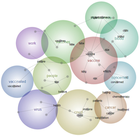 For the qualitative analysis of free-text comments, this was a combined analysis that included a significant proportion of people with cancer. The top three concepts generated by Leximancer software (vaccine, cancer, and COVID) were manually explored to identify themes. These analyses were used to create concept maps for each disease subgroup separately (cancer, MS, and diabetes), as well as for all three combined (Figure 3). The visual maps of keywords were similar across each of the three conditions with most clusters centred around vaccine safety (particularly blood clots for patients with cancer), immunity and vaccine timing, impact on their condition, interactions between vaccine and their treatment, as well as information in general. The HBM framework was used to help organise responses into themes. Overall, four dominant themes emerged correlating with our adapted HBM (Figure 2b). Representative verbatim quotations are listed below the identified themes.