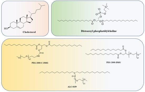 Figure 2. Cholesterol, a helper lipid, a PEG-lipid, and the RNA payload are common components of LNPs.
