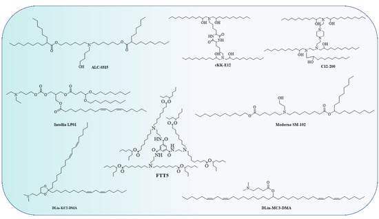 The Food and Drug Administration (FDA) has approved the use of LNPs (lipid nanoparticles) for the transport of siRNA to the liver [108] and mRNA vaccines [109,110]. Micelles, liposomes, and LNPs (Figure 1) are all different forms of lipids differentiated by the overall size of the hydrophilic head group and hydrophobic tail or tails [111]. Each of the four major components (cationic or ionizable lipid, helper lipid, cholesterol, and poly(ethylene glycol) (PEG)-lipid) (Figure 2) constitute FDA-approved LNPs. Studies using lipid-based delivery systems complexed with nucleic acid [112,113] indicate that lipid structure modifies LNPs’ interactions with cells [114]. Hundreds to thousands of chemically distinct lipid delivery systems [115,116] have been developed as a result of the fact that lipid structure influences the delivery of nucleic acids and that such systems can be easily produced using Michael addition-based, epoxide-based, and alcohol-based chemical reactions. Many of these studies aimed to enhance the delivery of siRNA to hepatocytes or the liver cells of mice [117]. In conjunction with a more rational approach to lipid design [114], these investigations reduced the dosage required for robust in vivo gene silencing in the hepatocytes of mice from around 1.0 mg/kg [118] to 0.002 mg/kg. DLin-KC2-DMA is an ionizable lipid [114]; cKK-E12 is a peptide-like lipid compound [119]; DLin-MC3-DMA [120] was used in patisiran to treat hATTR [108]; and C12-200 was synthesised using an epoxide–amine reaction [117], LNPs have been used to transport messenger RNA (mRNA) to the livers of mice, non-human primates, and humans. Some LNPs made use of lipids that have been optimised for siRNA transport. For instance, mRNA was transported to the liver in mice using LNPs in conjugation withcKK-E12 [121,122], C12-200 [123], and DLin-MC3-DMA [124]. mRNA has also been transported to the mice hepatocytes by more recently reported lipids such as LP01 [125] (Intellia Therapeutics), Lipid H [126] (Moderna), and FTT5 [127] (Ohio State and Beam Therapeutics) (Figure 3).