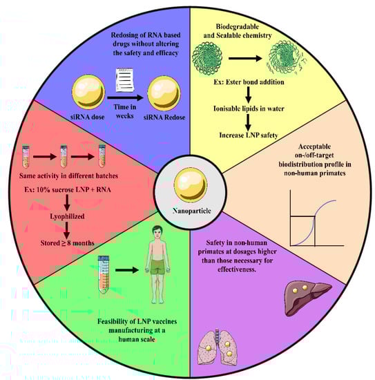 There has been a constant effort to develop nanoparticle-based RNA delivery using reported vehicles. A detailed pharmacokinetic and clearance clinical data have been reported regarding patisiran [196,197]. The approved animal models, toxicity readouts, and time points for patisiran were detailed in a report from the FDA Center for Drug Evaluation and Research [198]. These data provide a thorough roadmap for characterising nanoparticle-based RNA delivery of appropriate clinical outcome. In a broader sense, the 3 RNA drug delivery systems that have received FDA approval [108,199] or an EUA grant [200] thus far seem to have six qualities (Figure 6) that, when taken together, might be considered hallmarks of authorised delivery vehicles. To begin with, biodegradable, scalable chemistry is typically used in the fabrication of therapeutic delivery systems. The LNP safety of Moderna, Acuitas, and Alnylam lipids, all of which are used in humans, was enhanced by introducing ester linkages, which may breakdown in water, to form ionizable lipids [201]. The RNA-based delivery technique must be chemically simple to enable human-scale production; for instance, let us consider a clinical trial setting where injecting a vaccine into a patient weighing 100 kg was administered with 6 mg/kg lipid and 0.3 mg/kg RNA (that is, a lipid:RNA mass ratio of 20:1), roughly 1 g of lipid would be needed for a single vaccine unit, assuming that there is no loss of lipid during formulation development. GalNAc conjugates, attached to siRNAs or ASOs independently, can be manufactured on a human scale (with the capacity to manufacture a large batch that complies with cGMP or Current Good Manufacturing Practice). Only LNPs with four lipid components and no targeting ligands were approved by regulators. It is essential that those developing therapeutic nanoparticles should know the benefits and drawbacks of incorporating targeted ligands [202]. Third, there needs to be a good on-target to off-target delivery ratio using the RNA delivery system. Biodistribution and function are two metrics that may be used to assess on- and off-target delivery. Biodistribution is required for effective cytoplasmic RNA delivery, but it is not adequate because endosomes retain more than 95% of RNA [203]. Additionally, studies have demonstrated that very low siRNA copy numbers are effective for gene knockdown in vitro [204], suggesting that siRNA functions catalytically. Fourthly, the dose of RNA that is effective must be far smaller than the dose that causes harm. Due to undetermined factors, mice have not shown to be reliable models of RNA toxicity; therefore, this can be seen in non-human primates. Fifth, even after shipping, the drug’s efficacy must be uniform throughout the batches. Work is being conducted to stabilise mRNA-based drugs for this reason. Storage of lyophilized CureVac mRNA at 40 °C for up to 6 months at room temperature maintained for 3 years showed no loss of functionality [205]. Furthermore, unless cryoprotectants such as sucrose are utilised, lyophilization may reduce stability for LNP- encapsulated mRNA by encouraging lipid crystallisation [206]. With the addition of 10% sucrose, for instance, RNA-complexed lipid nanoparticles may be lyophilized and kept for up to ≥ 8 months without refrigeration [207].