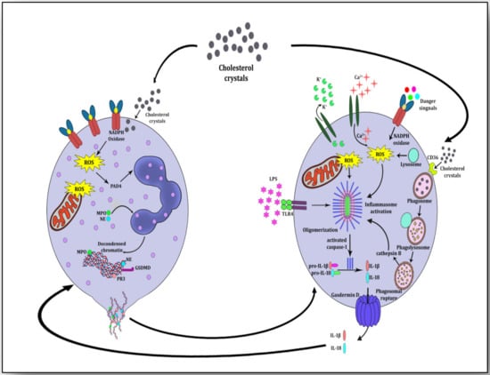 Clinical research on the signaling pathways leading to atherosclerosis has suggested that components of NETosis evoke NLRP3 inflammasome activation, which releases the proinflammatory cytokines IL-1β and IL-18. Both of these cytokines are very harmful for stimulating the atherosclerotic plaque to atherothrombosis and its rupture leading to ischemia. A study has revealed that monocyte-derived macrophages generate strong signals for inflammasome activation when they are incubated with NETs and then with cholesterol crystals []. This shows that NETs prime macrophages to produce pro-IL-1β and cholesterol crystals induce phagolysosomal damage due to internalization by binding to CD36 (a glycoprotein on the plasma membrane of macrophages). When macrophages ingest cholesterol crystals as cellular debris, they destroy them into phagosomes; these phagosomes deliver the degraded contents to lysosomes (phagolysosomes) where they are further degraded by acid hydrolases. These hydrolyzed contents of cholesterol crystals may cause the rupture of the phagolysosome membrane and the release of its contents into the cytoplasm which otherwise are exported outside the cell by membrane transporters [,]. These undegraded cholesterol crystals released into the cytoplasm due to phagolysosomal membrane rupture, are taken as danger signals which are sensed by PRRs, termed danger-associated molecular patterns (DAMPs) and pathogen-associated molecular patterns (PAMPs). NLRP3 is a significant member of the innate immune system which is a PRR and is activated in response to these danger signals. During NLRP3 inflammasome activation, it transposes ASC and regulates caspase-1 (CASP1) stimulation, which further proteolytically cleaves the mature forms of the proinflammatory cytokines IL-1β from pro-IL-1β and IL-18 from pro-IL-18. Present abundantly in atheromatous lesions, both IL-1β and IL-18 help in plaque development and its progression to ischemic stroke []. The consequent release of undegraded cholesterol crystals into the cytoplasm sets the wheel of inflammatory cascade (activating NLRP3 inflammasome) in motion through cycles of internalization of cholesterol crystals and continued phagolysosome rupturing (Figure 4). During acute inflammation, resolvins and selectins induce neutrophil apoptosis; they are engulfed and phagocytosed by macrophages in an effort to resolve inflammation and improve healing []. Hence, it is worthwhile to infer from the experimental evidence that cholesterol crystals incite both neutrophils and macrophages to initiate pronounced inflammation (NETosis and NLRP3 inflammasome activation) and destroy the neutrophil–macrophage amity which is otherwise anti-inflammatory, pro-healing and pro-repair [].