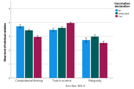 Religiosity was higher in the undecided (M = 2.92, SD = 1.07) than the vaccinated group (M = 2.63, SD = 1.17, p = 0.032), other comparisons were nonsignificant. The results are presented in Figure 2.