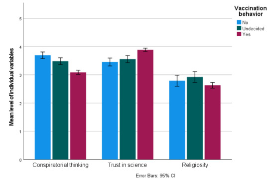 The same effects are true for actual vaccination against COVID-19, as the vaccinated group exhibited the highest trust in science and the lowest level of conspiratorial thinking, the unvaccinated group had the lowest trust in science and highest level of conspiratorial thinking, and the undecided were in the middle.