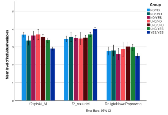 For Religiosity, it was lower in the YES/YES group than the UND/YES (p < 0.001) and the UND/UND group (p = 0.006); all other comparisons were nonsignificant. Descriptive statistics are presented in Table 1, and the results are presented in Figure 3.