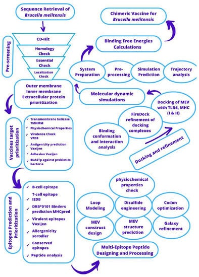 The study framework used for designing a multi-epitopes vaccine against B. melitensis is illustrated in Figure 1.