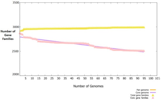 Pan-core plot. The number of fully sequenced proteomes used are plotted on the X-axis while gene families are plotted against each proteome on the Y-axis.