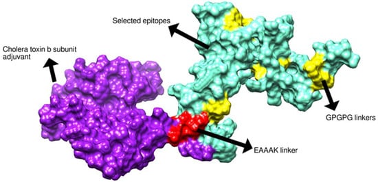 Peptide vaccines have weak ability to provoke host immune responses. The weak immunogenicity of the peptide vaccine can be handled with the technique of multi-epitopes peptide design [,]. In multi-epitopes peptide-design phase, immunodominant epitopes were linked to each other []. All the selected screened epitopes were linked with the Gly-Pro-Gly-Pro-Gly (GPGPG) linkers to build an immunopotent multi-epitopes peptide vaccine. Furthermore, the vaccine was linked with the highly immunopotent cholera toxin B adjuvant (CTB) for the enhancement of the vaccine immunogenicity [,]. The adjuvant binds to the monoganglioside GM1 receptor and is capable of stimulating cytokines, interferone, cellular and humoral immunity []. The adjuvant is used in vaccine design against cancer, tuberculosis and influenza [].