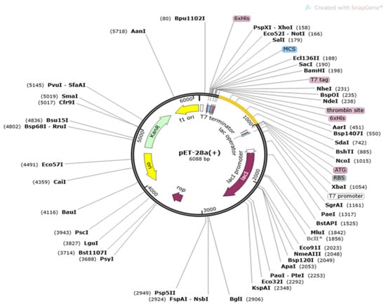 Cloning of multi-epitopes vaccine constructs (yellow color) into pET28a (+) vector.
