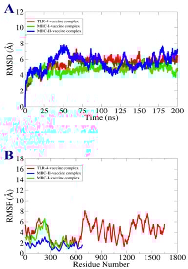 The dynamic behavior of the vaccine complexes was analyzed by using a molecular dynamics stimulation approach. Based on the lowest global energy value, the complexes were chosen for the MDS []. The AMBER20 stimulation software was used for simulation on a timescale of 200 ns []. For the completion of system setup phase, preprocessing and final production phase, the AMBER SANDER module was used []. The intermolecular interactions in the MDS were defined by FF14SB force field []. SHAKE algorithm was used to constrain hydrogen bonds []. The pressure equilibrium of the system was maintained by NPT ensemble. For the evaluation of trajectories, the CPPTRAJ module was used []. To investigate structure stability of complexes, root mean square deviation (RMSD) and root mean square fluctuation (RMSF) plots were produced in XMGRCE [].