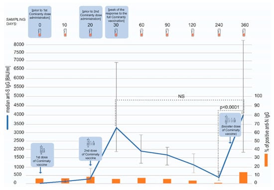The model of the study. The concentrations of anti-spike SARS-CoV-2 IgG antibodies at different timepoints are presented as medians and interquartile ranges (Q25, Q75). Over the course of the study, anti-S concentrations peaked twice—after the second dose (day 30) and then after the booster (day 360) (blue line). The dotted lines indicate statistical significance of the differences in the antibody concentration between the investigated timepoints, as assessed with Wilcoxon test. The percentage of the subjects testing positive for anti-nucleocapsid SARS-CoV-2 IgG antibodies (orange bars) was relatively low throughout the study, but a rise was visible on day 360.