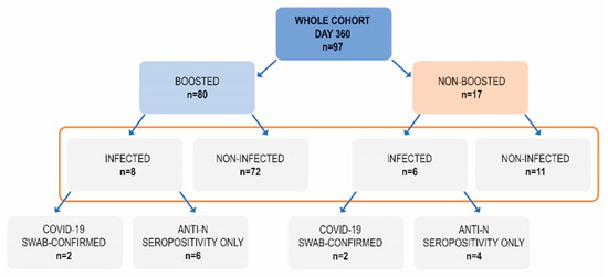 Out of 17 non-boosted subjects, as many as 35.3% had recently been infected. On the contrary, among 80 boosted subjects, there were only 10% who had recently been infected and this difference was statistically significant (p = 0.0206, Chi square test with Yates correction). Hence, this lower percentage may be attributed to the additional vaccine dose which was given at a median of 292 day—halfway between day 240 and 360. We could speculate that at least some out of eight infected subjects in the boosted group could have been infected before the booster. Retrospective analysis revealed that the non-boosted subjects who did not become infected between day 240 and 360 had had a higher median concentration of anti-S antibodies on day 240 (842 BAU/mL) than the non-boosted subjects who became infected—408 BAU/mL (Figure 4), although this difference was not statistically significant. Of interest, the subgroup of non-boosted, non-infected subjects included six who had had a history of COVID-19 (54% of the subgroup). Four of them had suffered from this disease before the first dose of vaccination and two had been infected after the primary inoculation regime but turned negative for anti-nucleocapsid IgG by day 120.