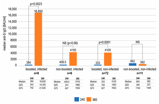 An increase in anti-spike SARS-CoV-2 IgG antibodies between days 240 and 360 shown separately for individuals boosted and non-boosted. The results are shown as medians and interquartile ranges (Q25, Q75). The rise was statistically significant only in the boosted subcohort (p = 0.0001, Wilcoxon test). On day 360, the boosted subjects displayed, as expected, a statistically significantly higher median anti-S IgG concentration (p = 0.0002, Mann–Whitney U test).