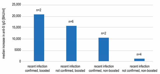 Since anti-N seropositivity is only an auxiliary means of COVID-19 diagnosis, we researched if any of 14 recent convalescents in our study had had a proven record of COVID-19. We hypothesized that the concentrations of anti-spike antibodies may differ between convalescents confirmed with swab testing (which may indirectly indicate a more severe disease course) and those only anti-N seropositive. A positive result of either PCR or antigen testing of the nasopharyngeal swab sample was found for four subjects. We observed a higher increase in the concentration of anti-spike antibodies between days 240 and 360 in convalescents with confirmed SARS-CoV-2 infection in comparison to those only seropositive, in both boosted and not boosted individuals (Figure 5). The small number of subjects did not allow for these differences to be analyzed statistically.