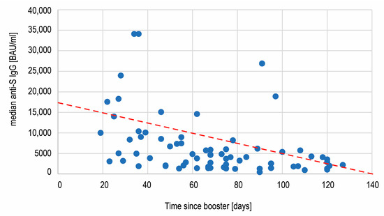 The wide range (434–34,100 BAU/mL) of the antibody titers on day 360 observed in the biggest subgroup of boosted but not infected individuals was examined further. A statistical analysis revealed that the antibody concentration was not dependent on age (below or over 60 years old) and sex of the subjects (Mann–Whitney U test, respectively, p = 0.9051 and p = 0.9830). Additionally, we found no correlation between age and antibody concentration (Spearman’s rank correlation, R = 0.0328, p = 0.7847). A correlation between the anti-S SARS-CoV-2 IgG concentration and the number of days between the booster shot and the measurement on day 360 was assessed (Figure 6). A statistically significant negative correlation (Spearman’s rank correlation) between these variables was revealed (R = −0.4789; p < 0.00001), showing the decrease of antibodies with time after vaccination.