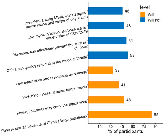 All participants had considered whether China would become a mpox endemic country, and 127 (82.5%) thought that China would become a mpox endemic country. Mpox could be easily spread domestically, due to the large population in China being chosen by most of the respondents. Those holding the opposing opinion (27, 17.5%) thought that China’s health system could quickly respond to the mpox outbreak (Figure 1).