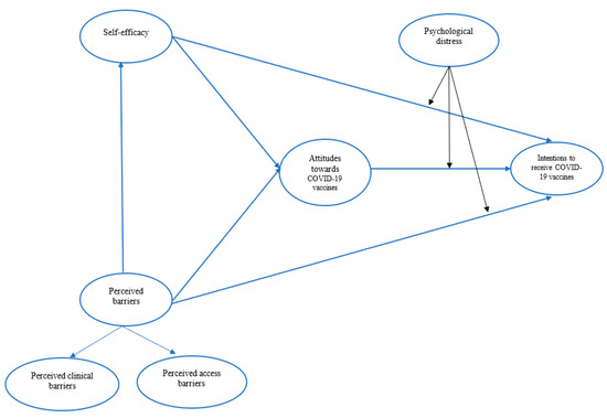 Moreover, although several prior studies have investigated the impacts of negative and positive antecedents on intention/hesitancy to receive COVID-19 vaccines [11,13,14], our understanding of the moderation effects of mental health problems, such as psychological distress, on COVID-19 vaccine acceptance and uptake is still limited [19]. Thus, this research aimed to bridge the literature gap by testing the moderation impacts of psychological distress on the paths from perceived clinical and access barriers, self-efficacy, and attitude towards COVID-19 vaccines to intention to receive COVID-19 vaccines. Simultaneously, the mediating role of self-efficacy and attitudes towards COVID-19 vaccines in the links between perceived barriers and intention to receive COVID-19 vaccines was also tested in our study.
