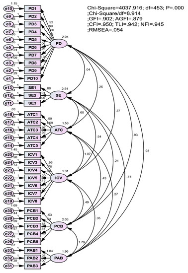 Results of the SEM analysis illustrated that the model reached a high level of fitness. Specifically, χ2(287) = 2995.814; Chi-square/df = 10.438; p < 0.01; GFI = 0.917 > 0.9; AGFI = 0.891 > 0.8; CFI = 0.945 > 0.9; TLI = 0.932 > 0.9; and RMSEA = 0.059 < 0.8 [1,8,43,45] while the R2 (Square Multiple Correlation) of SE, ATC and ICV reached 0.103, 2.39 and 0.607, respectively.