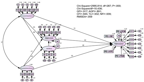 Table 4 reveals the correlations of constructs. First, results indicated that intention to receive COVID-19 vaccines was positively correlated with attitudes towards COVID-19 vaccines (γ = 0.623; p-value < 0.001), self-efficacy (γ = 0.060; p-value < 0.001) and perceived clinical barriers (γ = 0.142; p-value < 0.001), yet it was negatively influenced by perceived access barriers (γ = −0.445; p-value < 0.001). Second, self-efficacy was found to have a significant effect on attitudes towards COVID-19 vaccines (γ = 0.158; p-value < 0.001). Third, while perceived clinical barriers were positively associated with self-efficacy (γ = 0.677; p-value < 0.001) and attitudes towards COVID-19 vaccines (γ = 0.635; p-value < 0.001), perceived access barriers were found to have negative impacts on self-efficacy (γ = −0.215; p-value < 0.001) and attitudes towards COVID-19 vaccines (γ = −0.445; p-value < 0.001).