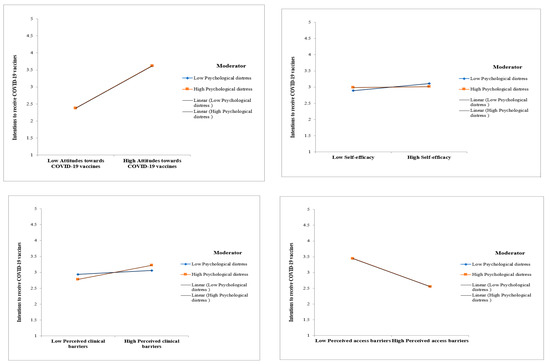 Most importantly, while almost all previous studies neglected the moderation impacts of mental health problems on the path from antecedents to individuals’ receipt of COVID-19 vaccines, our study illustrated that although psychological distress did not increase or reduce the impacts of attitudes towards COVID-19 vaccines and perceived access barriers on the intention to receive COVID-19 vaccines, psychological distress was found to reduce the effect of self-efficacy on intention to receive COVID-19 vaccines. In other words, the translation from self-efficacy into intention to receive COVID-19 vaccines was weakened by psychological distress; although individuals display high levels of confidence regarding COVID-19 vaccines, they hesitate to receive COVID-19 vaccines in case of high psychological distress. Moreover, our study also reveals that the positive impact of perceived clinical barriers on the intention to receive a COVID-19 vaccine can be stronger if the level of psychological distress is high. Thus, this study demonstrated the significant moderating influences of mental health issues on COVID-19 vaccine uptake.