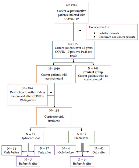 For this study, we analyzed data from the medical records of COVID-19-infected cancer patients at King Hussein Cancer Center (KHCC) who were between 18 and 91 years old. All KHCC patients were Middle Eastern (including Jordanians) and followed KHCC’s treatment protocols [27]. The KHCC Cancer Registry records were searched for PCR-positive COVID-19 patients (N = 1988). After excluding children, non-cancer patients, and duplicates, 1353 PCR-positive COVID-19 adult cancer patients’ tests remained. Three hundred and forty-three PCR-positive COVID-19 adult cancer patient tests and no history of corticosteroids were used as the control group. The remaining 1010 cancer patients received corticosteroids for various indications. We limited corticosteroid therapy to hydrocortisone or prednisone and the treatment window to seven days before or after a positive COVID-19 result, according to Jee and colleagues’ recent study [17]. Therefore, the number of hydrocortisone and prednisone-treated cancer patients who also had COVID-19 infection within seven days dropped to 116 (Figure 1).