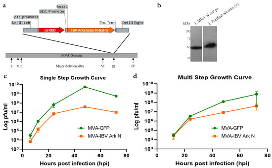 - Zanetti, F.A.; Zajac, M.P.D.M.; Taboga, O.A.; Calamante, G. Evaluation of modified vaccinia virus Ankara expressing VP2 protein of infectious bursal disease virus as an immunogen in chickens. J. Veter. Sci. 2012, 13, 199–201. [Google Scholar] [CrossRef]