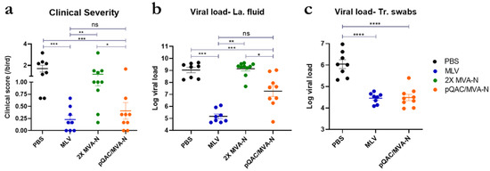 - Liu, R.; Americo, J.L.; Cotter, C.A.; Earl, P.L.; Erez, N.; Peng, C.; Moss, B. One or two injections of MVA-vectored vaccine shields hACE2 transgenic mice from SARS-CoV-2 upper and lower respiratory tract infection. Proc. Natl. Acad. Sci. USA 2021, 118, e2026785118. [Google Scholar] [CrossRef] [PubMed]