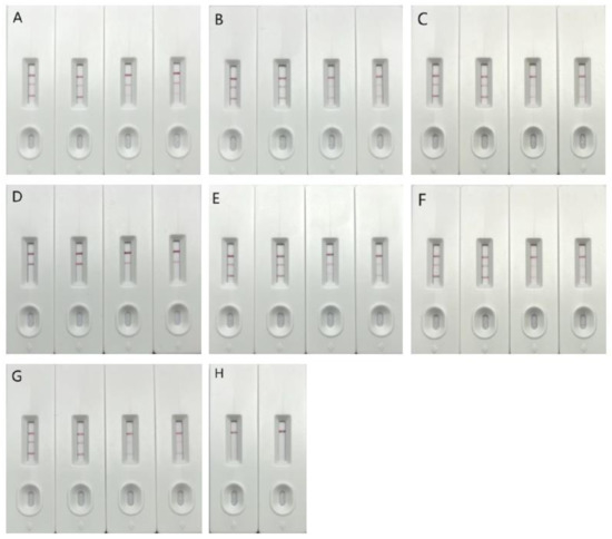 Evaluation of the sensitivity of the colloidal gold strip was performed by detection of the inactivated SARS-CoV-2 culture. The culture of SARS-CoV-2 inactivated by β-propiolactone was diluted 10-fold with lysate and labeled as 10, 102, 103, 104, 105, 106, 107, and 108. Then, the dipstick cards were sampled for each dilution to preliminarily confirm the detection limit. According to the color development of the test card, the 2-fold gradient series dilution was continued near the detection limit, and the color development degree of the C line and T line was observed. Finally, the lowest dilution concentration that could observe positive results was used as the lowest detection limit of the test card sensitivity [20].