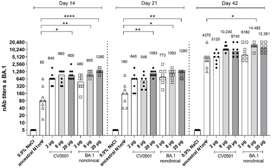 Virus neutralizing antibodies (nAbs) against BA.1 were measured in sera from rats immunized with two doses of ancestral N1mΨ (8 µg), CV0501 (2, 8 or 20 µg) or BA.1 nonclinical (2, 8 or 20 µg) vaccines (Figure 1). Compared with NaCl-treated controls, the first dose (Day 0) of CV0501 and BA.1 nonclinical induced robust nAb responses against the BA.1 variant (measured on Days 14 and 21), with titers increasing between 8 and 19-fold between Day 21 and Day 42. Compared with the 8 µg ancestral N1mΨ vaccine, BA.1 nonclinical (8 and 20 µg) induced significantly higher BA.1-specific nAb titers at all timepoints. Similar differences were observed for CV0501. No significant differences were detectable between CV0501 and BA.1 nonclinical at any time point.