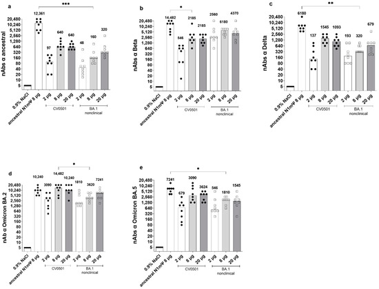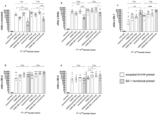 All regimens (2 µg and 8 µg) featuring ancestral N1mΨ priming induced higher nAb titers against the ancestral and Delta variants than the regimen combining BA.1-based priming and boosting (Figure 4a,b, Table 3) with statistically significant differences observed for CV0501/ancestral N1mΨ and ancestral N1mΨ (2 and 8 µg doses) but not the 8 µg dose for ancestral N1mΨ against Delta. On the other hand, the regimen employing only BA.1 based vaccines produced numerical higher nAb titers against the BA.1 and BA.2 variants than the regimens based on ancestral N1mΨ priming (Figure 4c,d, Table 3). Similar levels of nAbs against BA.5 were induced in all the 2 µg groups. All 8 µg groups, primed with ancestral N1mΨ, followed by booster vaccination with CV0501 as a monovalent or bivalent, had significantly increased BA.5 nAb titers compared with ancestral N1mΨ boosting (Figure 4e).