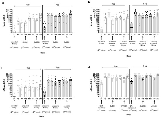 BA.1-specific nAb titers increased between Day 21 and Day 42, following the second priming dose in all groups. In general, titers induced by priming were numerically higher in the 8 µg groups compared with the two µg groups. The highest nAb titers against BA.1 upon priming were observed in the serum of BA.1 nonclinical-primed rats (Figure 3d, Table 2). Following a third vaccine dose (first boost) on Day 105, increases in nAb titers against BA.1 were observed for all vaccine combinations (Day 105 vs. Day 133), although the effect was more pronounced in the 2-µg ancestral N1mΨ-primed groups (Figure 3a,b). The highest-fold increase in nAbs between Day 105 and Day 133 in the 2 µg groups primed with ancestral N1mΨ was observed upon CV0501 boosting (5.6-fold) (Figure 3a), followed by bivalent CV0501/ancestral N1mΨ boosting (1.9-fold) (Figure 3b) and ancestral N1mΨ boosting (1.5-fold) (Figure 3c). Priming and boosting with BA.1 encoding vaccines induced the lowest increase of 1.2 fold between Day 105 and Day 133 (Table 2) (Figure 3d). The differences were less pronounced in the 8 µg dose groups although the BA.1 nonclinical-primed/CV0501 boost group showed a 2.3-fold increase in nAbs between Day 105 and Day 133 (Table 2). In all 2 µg and 8 µg vaccine dose groups, the second booster dose (Day 189) increased BA.1-specific nAb titers (Day 189 vs. Day 217), although none of the increases were statistically significant (Figure 3). The fold increase in neutralizing titers after second boost (Day 189) followed the trend of the first boost (Day 105) (Table 2).