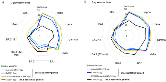 Priming of rats with ancestral N1mΨ results in induction of broader ACE2-binding inhibiting antibodies compared to priming with BA.1 nonclinical with little variance induced by selection of booster vaccine. Wistar rats (n = 8/group) were primed on Days 0 and 21 with 2 or 8 µg of ancestral N1mΨ or BA.1 nonclinical (black line) and boosted on Day 105 with either CV0501 alone (dark blue line and black line), ancestral N1mΨ alone (light blue line) or the bivalent combination CV0501/ancestral N1mΨ (orange line). Sera collected on Day 133 from rats receiving 2 µg vaccines was diluted 1:1600 (a) and from rats receiving 8 µg vaccines was diluted 1:3200 (b) for the ACE2 binding inhibition assay. Data are displayed as the percentage RBD-binding inhibition, with 0% being in the inner circle and 100% in the outmost circle.