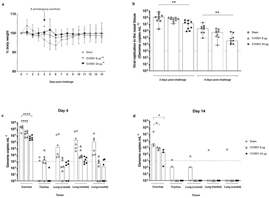 Immunization with CV0501 provided protection against Omicron BA.2 challenge in Syrian hamsters. Male Syrian hamsters (n = 9/group) received either 8 µg or 24 µg CV0501 or 0.9% NaCl (sham controls) on Days 0 and 28, followed by challenge with Omicron BA.2 (105 TCID50/animal administered i.n. at 0.05 mL per nostril) on Day 56. (a) Percentage body weight was recorded daily between Days 0 and 14 post-challenge. Each dot represents the mean value of the group at the indicated time points. Error bars show the SD in each group. Statistical analyses were performed using Dunnett’s Test for multiple comparisons. (b) Viral replication in the nose was assessed in nasal wash samples collected on Days 2 and 4 post-challenge by RT-qPCR. Each dot represents an individual animal, bars represent the median value of the group at the various time points. Statistical analyses were performed for Days 2 and 4 days post-challenge separately using Kruskal-Wallis test and Dunnett‘s Test for multiple comparisons. The dashed line indicates the lower limit of detection for the assay. (c,d) Viral loads were assessed in conchae, trachea and lung (cranial, caudal and medial) samples collected on Day 4 (c) or on Day 14 (d) post-challenge. Each dot represents an individual animal, bars depict the median value of the group at the various time points. Statistical analysis was performed using two-way ANOVA testing. Samples exhibiting less than 103 genome copies per mL (dashed line) were considered negative. * p < 0.05, ** p < 0.01, **** p < 0.0001.