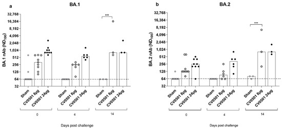 Significant induction of nAb against BA.1 and BA.2 Omicron variants observed after CV0501 vaccination. Hamsters (n = 9/group) were immunized on Days 0 and 28 with 8 µg or 24 µg doses of CV0501 (white and black circles respectively) or 0.9% NaCl (sham controls) (grey circles) and challenged on Day 56 with Omicron BA.2 (105 TCID50/animal administered i.n. at 0.05 mL per nostril). nAbs against BA.1 (a) and BA.2 (b) were assessed in sera collected on Days 0 and 4 (6 animals/groups) or Day 14 (3 animals/groups) post-challenge. Virus nAb titers expressed as the neutralizing dose (ND) 100 of the sera. Each dot represents an individual animal, and the bars represent the median value of the group at the various time points. The horizontal dotted lines indicate the lower limit of detection of the assay. Statistical analysis was performed using two-way-ANOVA and Dunnett’s Test for multiple comparison. ** p < 0.01, *** p < 0.001.