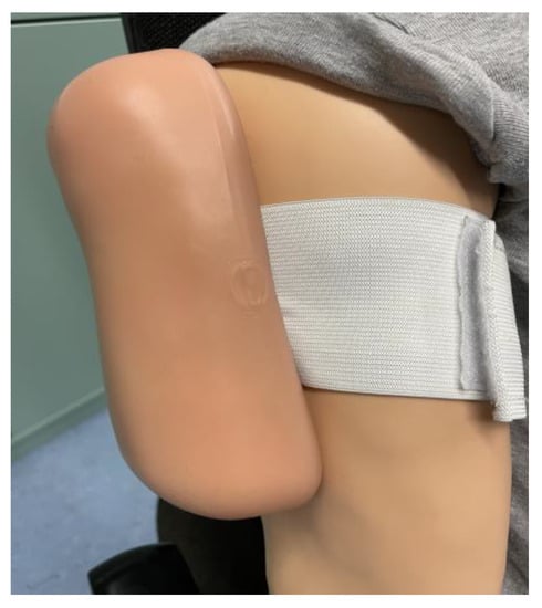 In order to meet these—as well as future—challenges, vaccination administration training should be implemented into the curriculum of pharmaceutical education. Currently, pharmacists in at least 13 countries are required to complete additional training with respect to vaccination administration []. For instance, Australia and the USA have included teaching content related to immunization in the pharmacy curriculum [,]. The efficacy of a university course for the purposes of training pharmacy students in vaccine administration has been demonstrated and evaluated by many studies [,,,]. However, in Germany, additional training with defined content has been offered recently for the purposes of training pharmacists in a continuous education and training program []. The training covers the following areas: practical administration of the vaccination; obtaining patient information and consent; observing contraindications; as well as recognizing emergency situations and their measures []. The course consists of a theoretical and practical part, in which the injection is performed on a low-fidelity simulator (LFS)—i.e., a model arm or wearable pad with a tissue-like structure (Figure 1). In addition, participants have the option to perform an injection with a sodium chloride solution on a real person after obtaining consent, and the entire course is supervised by a trained doctor.
