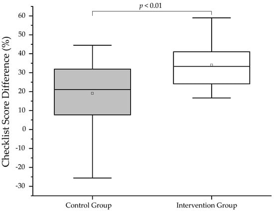 Figure 5. Box plots of analytical checklist score difference between pre- and post-Training OSCE. A one-sided Mann–Whitney test with a significance level of alpha = 0.05 was used to compare OSCE scores between groups.