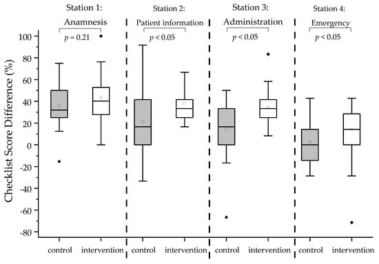 Figure 6. Box plots of analytical Checklist score differences for each station between pre- and post-training OSCE for respective groups. The black diamonds (♦) indicate the outliers. A one-sided Mann–Whitney test with a significance level of alpha = 0.05 was used to compare OSCE scores between groups.