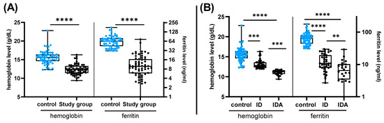 The levels of hemoglobin and ferritin among control and study group. (A) Hemoglobin levels (g/dL) and ferritin levels (ng/mL) for control group and study group (ID and IDA combined). (B) Hemoglobin and ferritin levels for control group and study group (separated as ID and IDA). Boxes represents 25th to 75th percentile range, black line demonstrates the median, and whiskers show minimum and maximum values. p values were calculated by Mann–Whitney U test and Kruskal–Wallis test, as appropriate. ** = p value < 0.01, ***, = p value < 0.001, **** = p value < 0.0001.