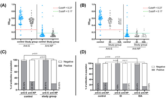 Optical density (OD) values and the prevalence of anti- SARS-CoV-2 S and NP IgGs among control group (normal hemoglobin and ferritin) and study group (ID, IDA). (A,B) Optical density values at 450 nm (OD450) as obtained from S- and NP-based ELISAs for control and study group: (A) ID and IDA combined and (B) ID and IDA separated. Dashed red lines represent the cut-off value for S-ELISA (OD450 = 0.27) and dashed green lines represent NP-ELISA cut-off value (OD450 = 0.17). (C,D) The prevalence (%) of anti-S and anti-NP in control and study group: (C) ID and IDA combined and (D) ID and IDA separated. p values were calculated by Fisher’s exact test, p value < 0.05 is considered significant.