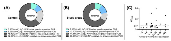 Further analysis performed on IgG NP findings revealed that 62.50% (20/32) did not belong to participants who reported previous COVID-19 infection but rather, belonged to those who did not report any previous infection (Figure 3A,B). Interestingly, 53.83% (14/26) of those who reported a previous infection tested negative for IgG NP. These findings indicate that many participants with positive IgG NP were unaware of a possible COVID-19 infection acquisition prior the time of the study. In addition, the noticed variability with IgG NP results despite the time after infection suggests the unpredictability of after-infection immunity (Figure 3C).