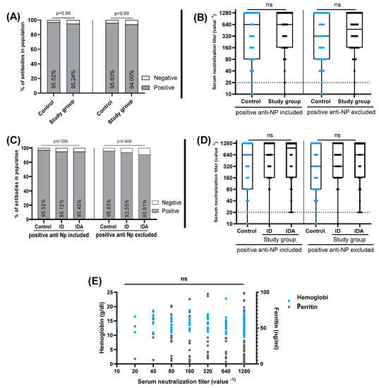 When SN was employed for further confirmation and assessment of neutralizing capacity of the antibodies produced by vaccines, the results obtained corresponded well with ELISA since 95.24% (60/63) of the study group and 95.52% (64/67) of the control group tested positive (p > 0.99, 95% CI = 0.2416 to 4.706). When IgG NP sero-positive samples were excluded, a negligible change was observed, as shown in Figure 4A. Where 94% (47/50) and 95.83% (46/48) of the study group and control, respectively, remained positive expressing no significant difference. We further assessed whether iron deficiency may affect the titer of neutralizing antibodies, and we did not identify any significant difference between the study group and controls that persisted even after anti-NP sero-positive samples were excluded (Figure 4A,B). Similar findings were obtained when the study group was subdivided into ID and IDA (Figure 4C,D). Moreover, we did not find a statistically significant correlation between hemoglobin and ferritin levels with serum neutralization titer (Figure 4E).