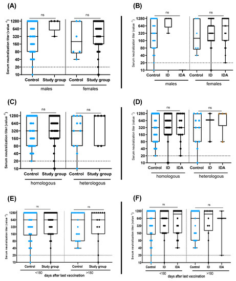 Finally, when the scale was adjusted for gender (Figure 5A,B), type of vaccine administered (homologous or heterologous) (Figure 5C,D), or number of days since vaccination (Figure 5E,F), and while excluding anti-NP positive samples, no significant differences were observed. Again, combining or separating ID and IDA in the study group did not affect our findings.